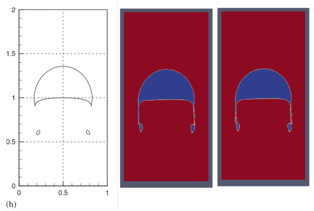 Conducting a rising bubble in different media based on the buoyancy force. Left) Experimental data, Mid and Right) different CFD methods based on Volume of Fluids (VoF)