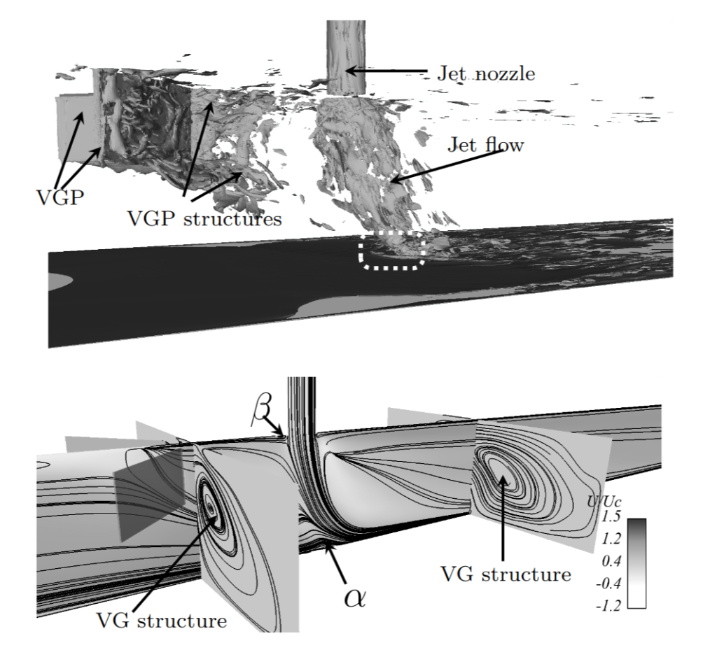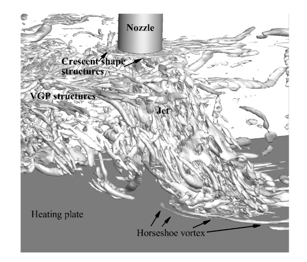 horseshoe vortex around the impingement region. β points the crescent shape structures around the jet